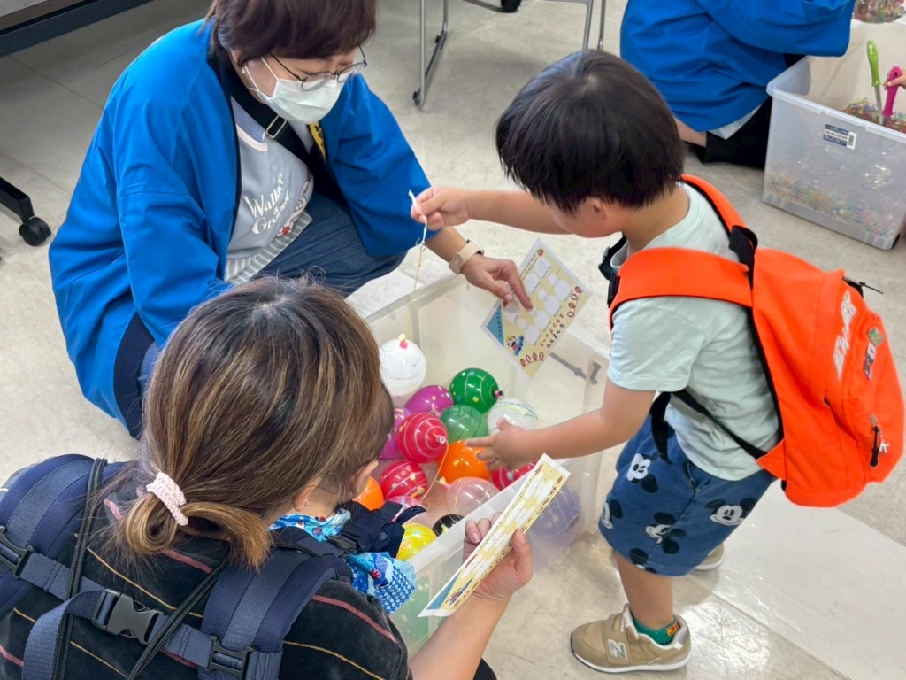 学生や職員はカラフルな法被を着て、みんなをお出迎え。スタンプラリーや輪投げ、さかなつりやスイカ割りなど6つの体験を用意しました。一週間前の事前準備にも学生が来てくれ、道具を作ったり遊び方を考えたりなどしてもらいました。