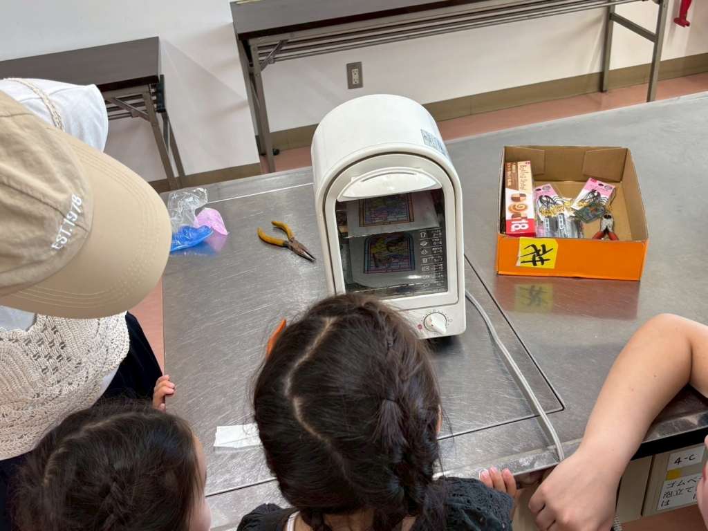 プラバンをオーブンに入れ、縮み始めると子どもはびっくり。世界に一つだけのキーホルダーができあがり、嬉しそうに持って帰りました。スライム作りは不思議な感触やきれいな色にみんなが夢中に。